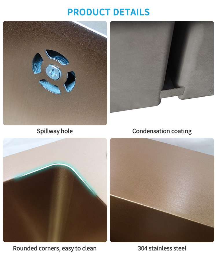 Wastafel nano (Emas), berbeda dari wastafel tunggal ganda biasa, memiliki tampilan warna emas mawar yang berbeda untuk menarik perhatian klien dengan cepat, yang lebih disukai keluarga muda yang mencari mode dan selera unik.Selain itu, lebih tahan lama dan tahan terhadap goresan, noda dan korosi air.